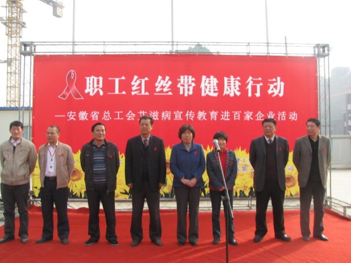 2010年11月24日上午,第23個“世界艾滋病日”即將來臨之際,由安徽省總工會、省建工集團開展的“職工紅絲帶健康防艾宣傳進百家企業(yè)活動”在省二建天下錦城二期項目部舉行啟動儀式,省總工會廳級巡視員、省女職工委主任牛和桂,省建工集團工會副主席李鵬飛,工會女職工委主任胡愛紅,省二建黨委書記朱治淮、工會主席李林等出席了啟動儀式。該項目部百余農(nóng)民工表示,今后要積極主動地加入到預防和控制艾滋病的行動中來,為遏制艾滋病在我省流行蔓延盡到應(yīng)有的貢獻。
