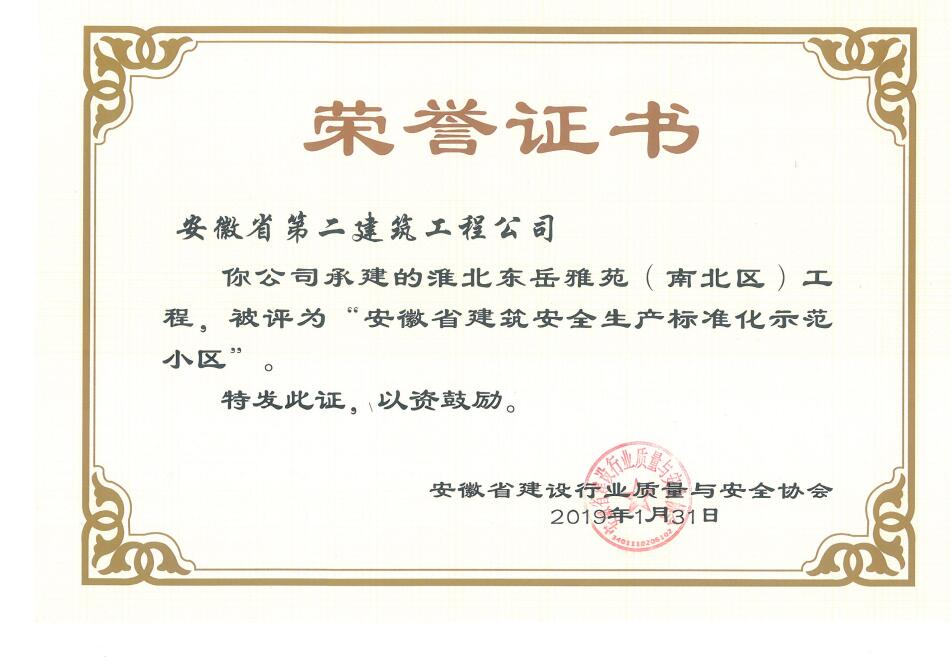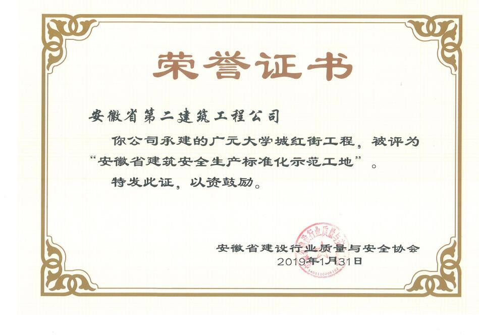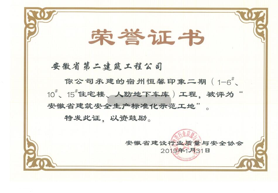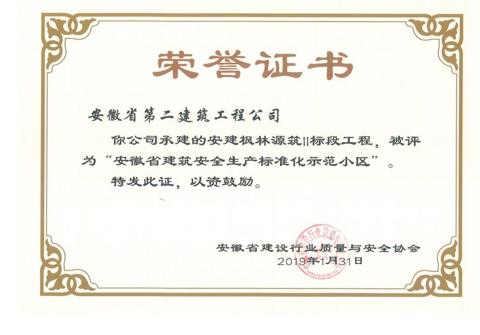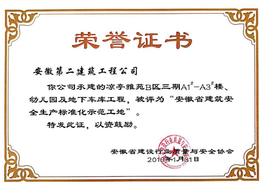 近日,從安徽省建設(shè)行業(yè)質(zhì)量與安全協(xié)會(huì)獲悉,安徽二建承建的肥西涼亭雅苑、阜陽楓林源筑、阜陽廣元大學(xué)城、宿州恒馨印象、淮北東岳雅苑5個(gè)項(xiàng)目獲得2018年度“安徽省建筑施工安全生產(chǎn)標(biāo)準(zhǔn)化示范工地”稱號(hào),為公司再添榮譽(yù)。