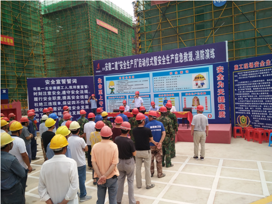 6月16日上午,安全管理部組織、信訪保衛(wèi)部及后勤綜合服務(wù)部協(xié)同在五分公司固鎮(zhèn)名邦國(guó)際花都項(xiàng)目開展6.16安全咨詢?nèi)?、安全宣誓、簽名、?yīng)急救援演練、職工體檢、安全主題宣講、安全生產(chǎn)經(jīng)驗(yàn)交流、安全教育場(chǎng)館體驗(yàn)、安全宣傳圖牌展覽等一系列“安全生產(chǎn)月”宣傳教育活動(dòng),分管安全副總經(jīng)理葉和永任總指揮,項(xiàng)目部全體管理人員及工人共一百余人參加。