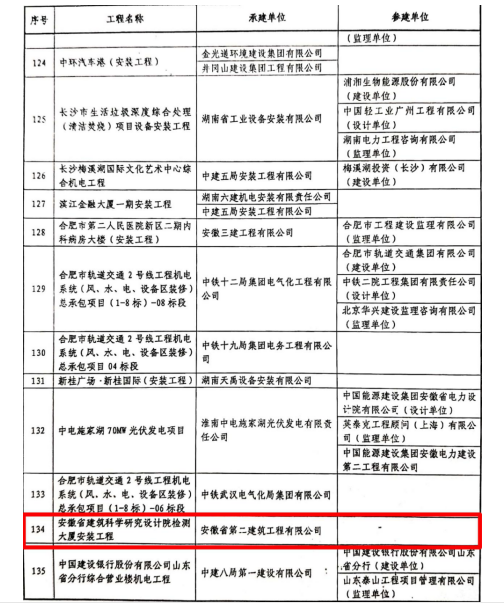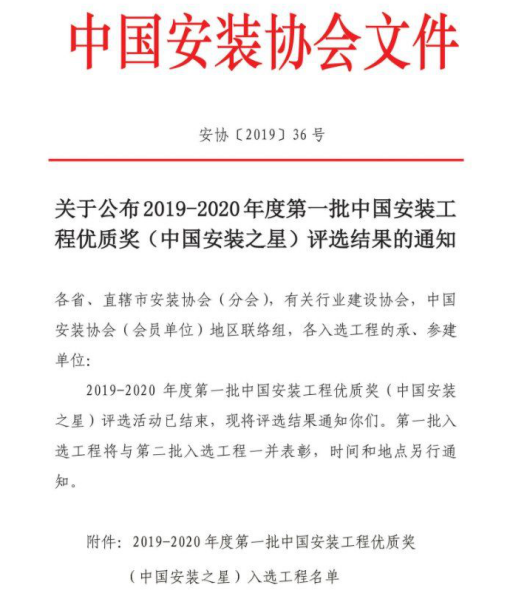 10月12日至13日,中國(guó)安裝協(xié)會(huì)組織的專家組一行對(duì)安徽二建公司承建的安徽省建筑科學(xué)研究設(shè)計(jì)院建筑檢測(cè)大廈工程進(jìn)行“中國(guó)安裝之星”工程的驗(yàn)收,公司總工程師邱立龍、五分公司經(jīng)理朱楊杰、支部書記朱慶年攜建科院項(xiàng)目經(jīng)理等人陪同驗(yàn)收。專家組對(duì)電氣及儀表、設(shè)備、管道三個(gè)安裝分段工程資料及工程實(shí)物驗(yàn)收,并對(duì)該項(xiàng)目安裝工程質(zhì)量給予很高的評(píng)價(jià)。2019年12月13日參加2019年度中國(guó)安裝之星評(píng)審?fù)ㄟ^,獲得中國(guó)安裝工程優(yōu)質(zhì)獎(jiǎng)(中國(guó)安裝之星)。