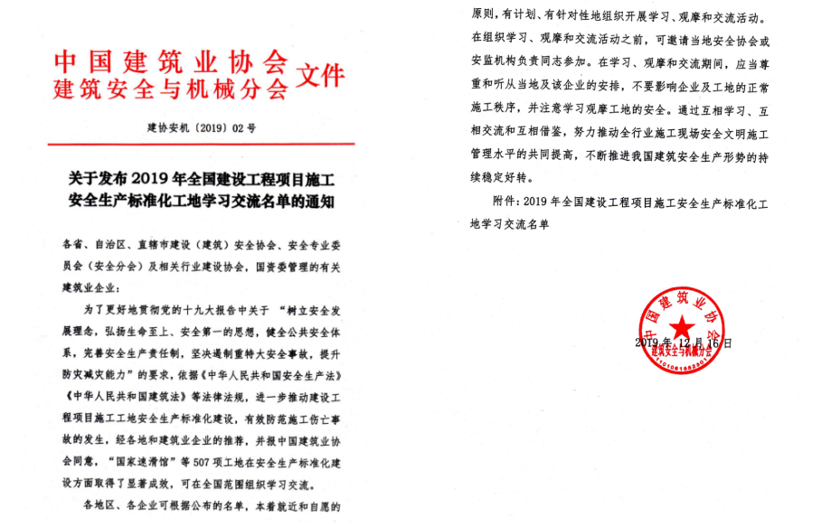 2020年1月16日,中國(guó)建筑業(yè)協(xié)會(huì)建筑安全與機(jī)械分會(huì)傳來(lái)喜訊,安徽二建承建的廣元大學(xué)城•紅街項(xiàng)目榮獲2019年度全國(guó)“建設(shè)工程項(xiàng)目施工安全生產(chǎn)標(biāo)準(zhǔn)化工地”榮譽(yù)稱號(hào)。