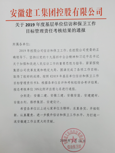 安徽二建信訪保衛(wèi)工作在公司黨委的正確領(lǐng)導(dǎo)下,圓滿完成了2019年度的各項工作任務(wù)。在集團信訪保衛(wèi)部組織的《2019年基層單位信訪和保衛(wèi)工作目標管理責(zé)任書》考核評比中榮獲第一名。