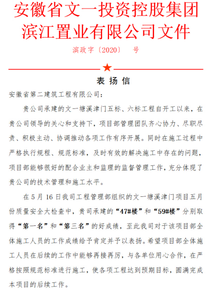 安徽二建文一·塘溪津門五標(biāo)項目管理團(tuán)隊堅持疫情防控與復(fù)工復(fù)產(chǎn)兩手抓、兩手硬,管理團(tuán)隊齊心協(xié)力、盡職盡責(zé)、積極主動,保質(zhì)保量完成施工任務(wù)。在5月16日安徽省文一投資控股集團(tuán)濱江置業(yè)有限公司工程管理部組織的五月份質(zhì)量安全大檢查中,“47#樓”取得第一名的好成績,獲建設(shè)單位通報表揚(yáng)。