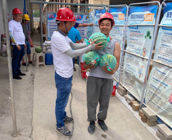 黃盱一行給項(xiàng)目員工送去慰問和關(guān)懷,準(zhǔn)備了毛巾、風(fēng)油精、十滴水、西瓜等防暑降溫用品,囑咐大家要合理安排工作時(shí)間,在做好工作的同時(shí),加強(qiáng)自身防護(hù)。