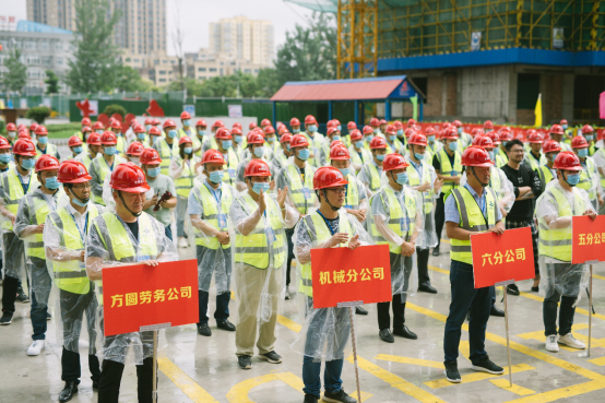 6月18日上午,安徽二建公司“戰(zhàn)疫情、搶工期、保目標、促超產”勞動競賽啟動儀式在淮北國金華府(紫麟苑)項目現場舉行?;幢笔凶〗ň痔瞥蔂I處長、副處長張喜明、質監(jiān)站徐棟副站長、淮北市相山區(qū)住建局呂鵬宇局長、淮北國金置業(yè)有限公司董事長許偉應邀出席儀式。公司領導班子成員、機關相關部門人員及所屬各單位主要領導、分管安全領導等共計150余人參加活動,工會女工主任王俊主持啟動儀式。