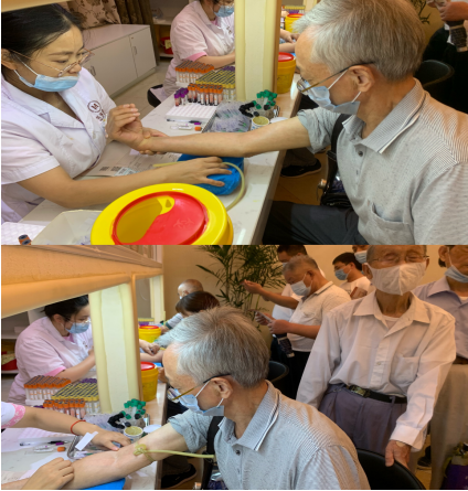 退休老職工有序排隊(duì)進(jìn)行抽血檢查
