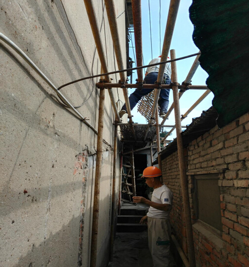 近日,公司后勤綜合服務部在對公司老舊房屋進行日常巡查時發(fā)現(xiàn),原四分公司生活基地大禮堂山墻檐口出現(xiàn)間斷式沉降斷裂。經檢查,此處的問題是由墻體自重及屋面木質結構自然腐朽所導致的。山墻腳即是住戶出入通道,隨時有墜落傷人的安全隱患。鑒于大禮堂層高十幾米,無法實施維修處理,我部第一時間向領導匯報后,及時拿出整頓方案,頂著烈日高溫,立即沿山墻搭建一條十幾米長的鋼管架安全通道,排除了隱患,確保居民出入平安。