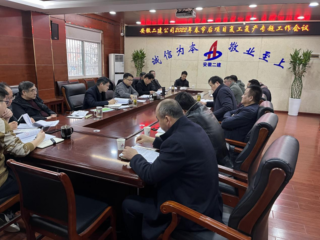 2月16日下午,安徽二建公司在一樓會議室召開了節(jié)后項(xiàng)目復(fù)工復(fù)產(chǎn)專題工作會議。公司總經(jīng)理李建成、財(cái)務(wù)總監(jiān)王干出席會議,會議由副總經(jīng)理葉和永主持。公司工程管理部、法務(wù)部(債權(quán)回收辦)、財(cái)務(wù)資產(chǎn)部、物資設(shè)備部、成本合約部、安全管理部、技術(shù)質(zhì)量部負(fù)責(zé)人、所屬各單位經(jīng)理、生產(chǎn)副經(jīng)理參會。