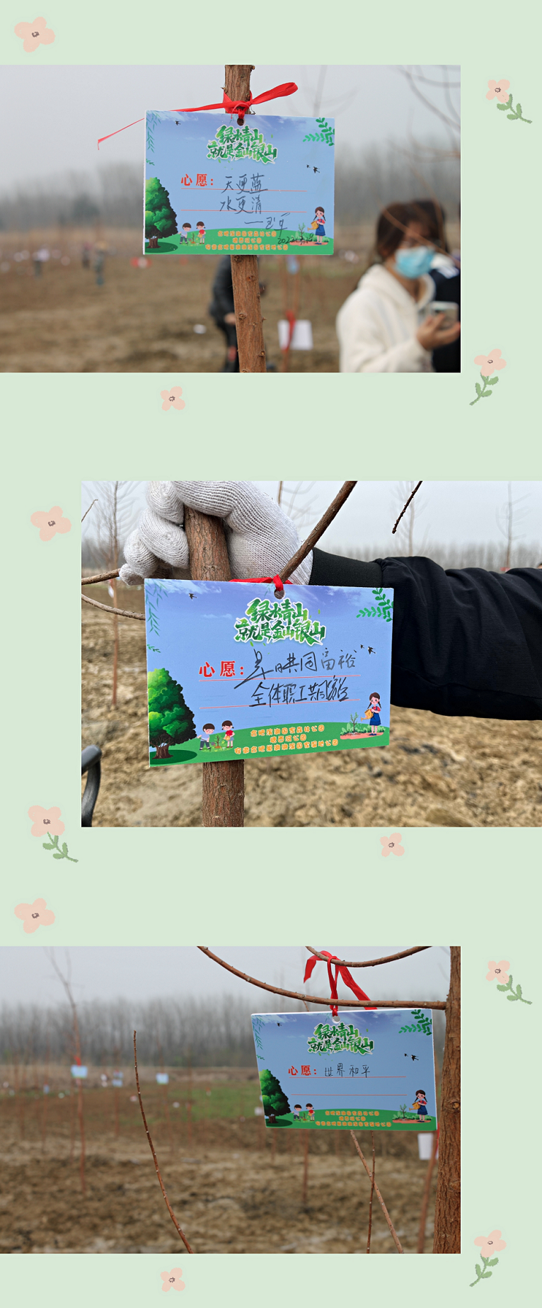 大家個(gè)個(gè)干勁十足,不畏辛苦,圓滿完成了種植任務(wù),還給自己種下的樹苗掛上了心愿卡片。