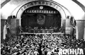 4月23日,在延安楊家?guī)X中央大禮堂,七大開幕式的主席臺上,懸掛著毛澤東和朱德的巨幅畫像,鮮艷的黨旗掛在兩邊。會場后面的墻上,掛著“同心同德”四個大字。兩側墻上張貼著“堅持真理”“修正錯誤”等標語,靠墻邊插著24面紅旗,象征著中國共產黨24年奮斗的歷程。插紅旗的“V”字形木座是革命勝利的標志。在主席臺的正上方,懸掛著一條引人注目的橫幅:“在毛澤東的旗幟下勝利前進!”